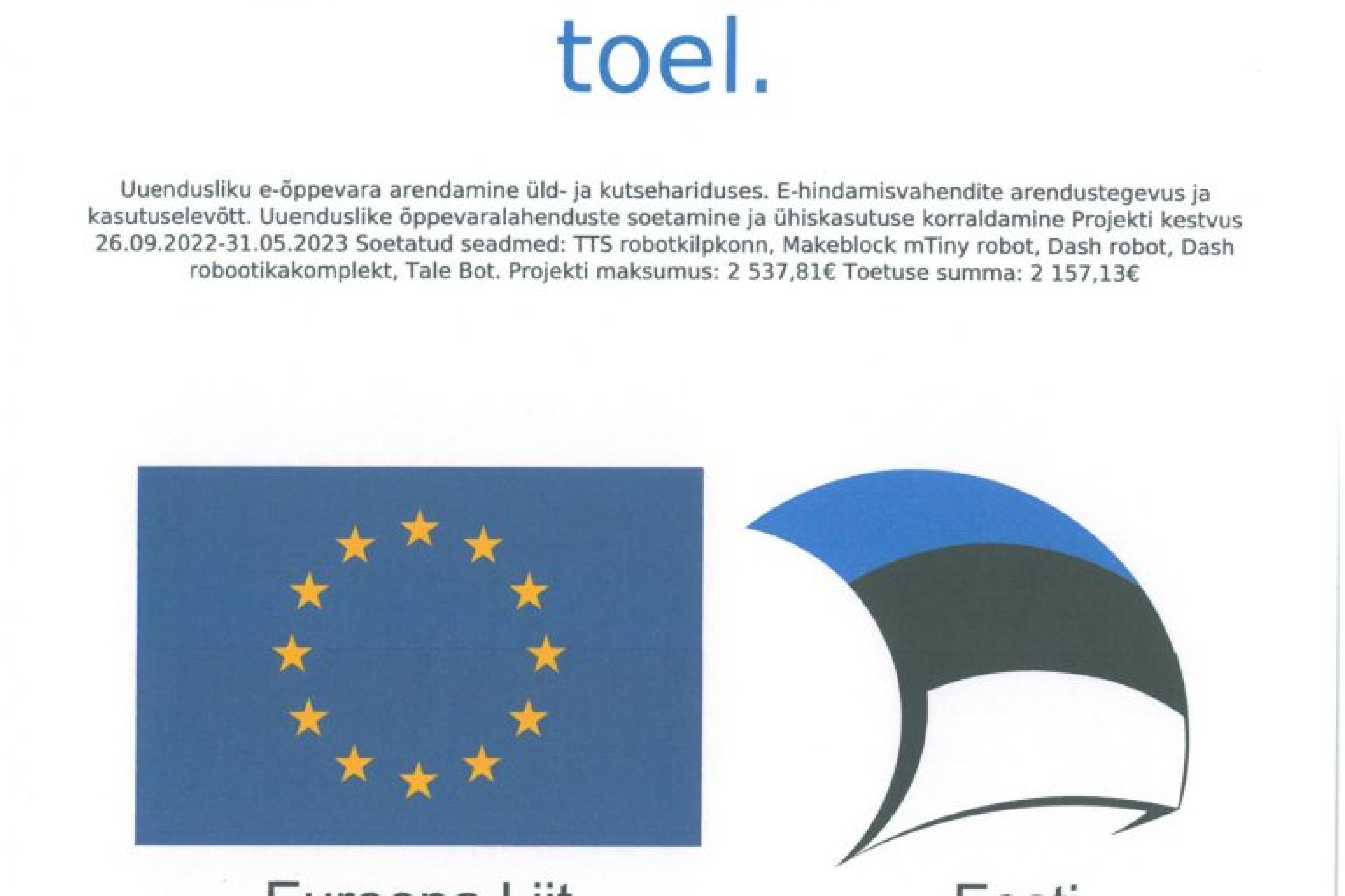 Projekti maksumus: Projekti abikõlblik kogukulu on 2 537,81 eurot.